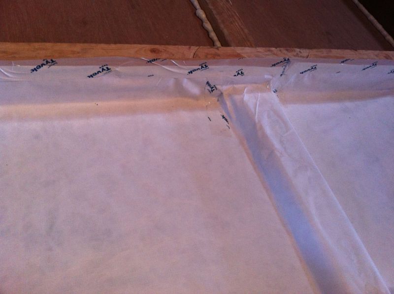 Step 7: Tape each cut and all along the entire edge of the bay so that it is completely sealed. If you rip the wrap anywhere, slap on a piece of tape and make sure all your staples are covered. In theory, as long as the house wrap tape holds (which is extremely sticky), each bay should be completely sealed off from the exterior.