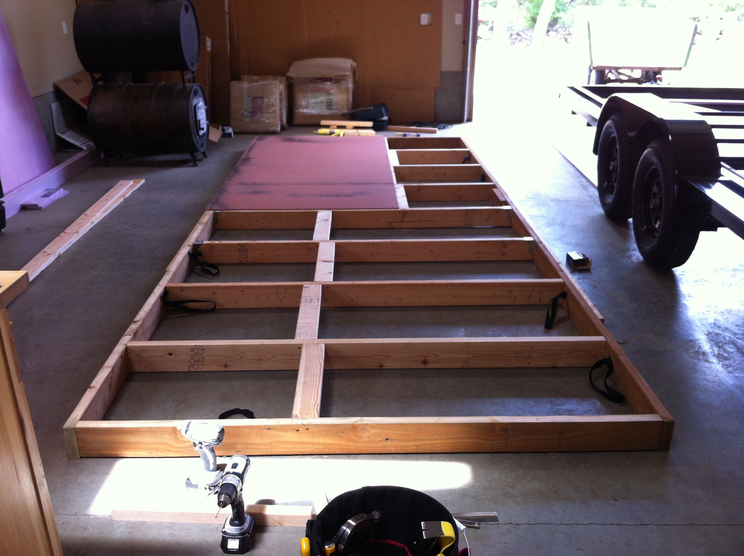 Putting on the first piece of undercarriage: 1/4″ marine-grade ply with two coats of oil-based paint (from the oops bin at the store – hence the lovely color!). The rows of nailers are offset so the seams between the plywood sheets will be staggered.