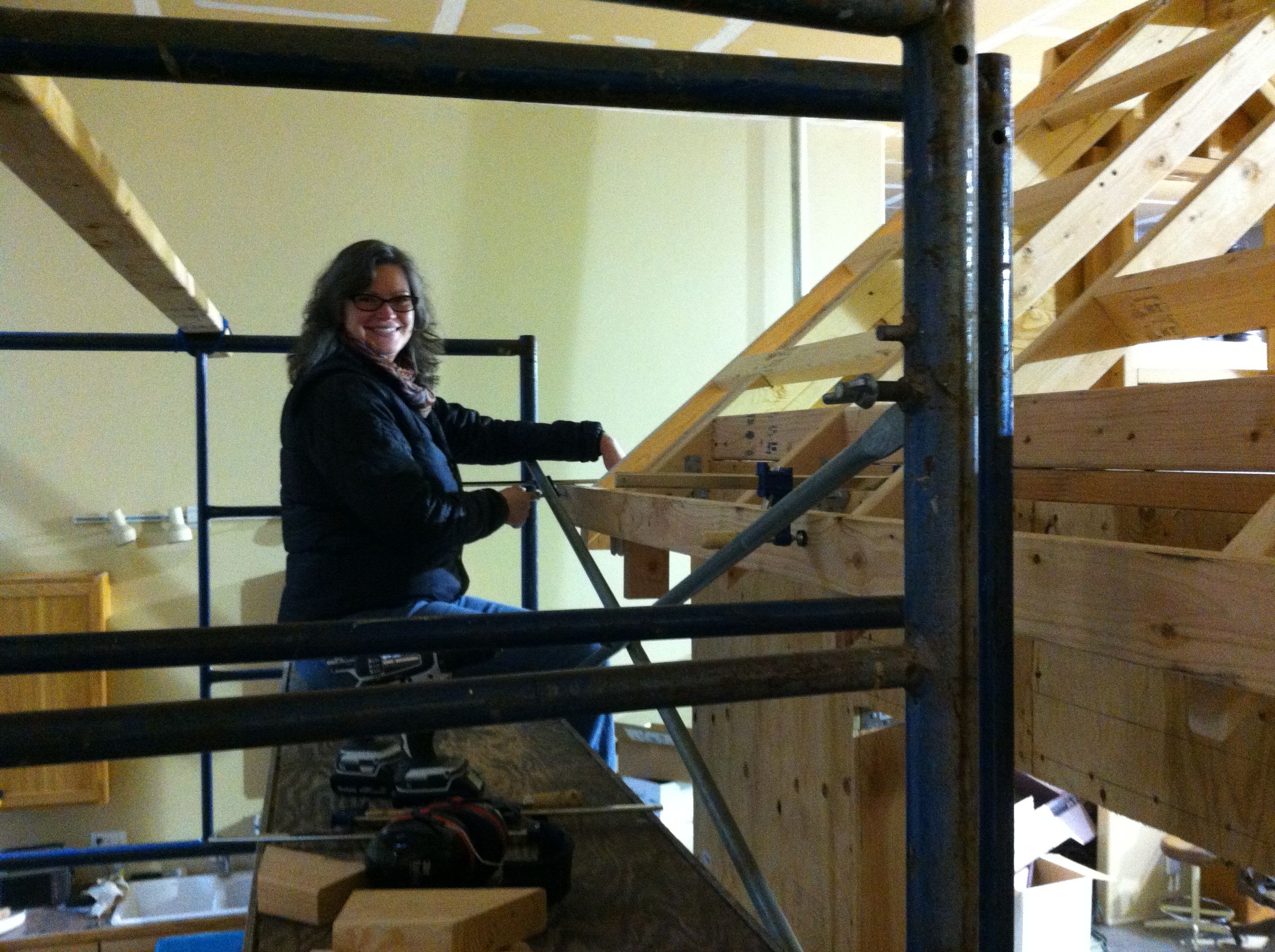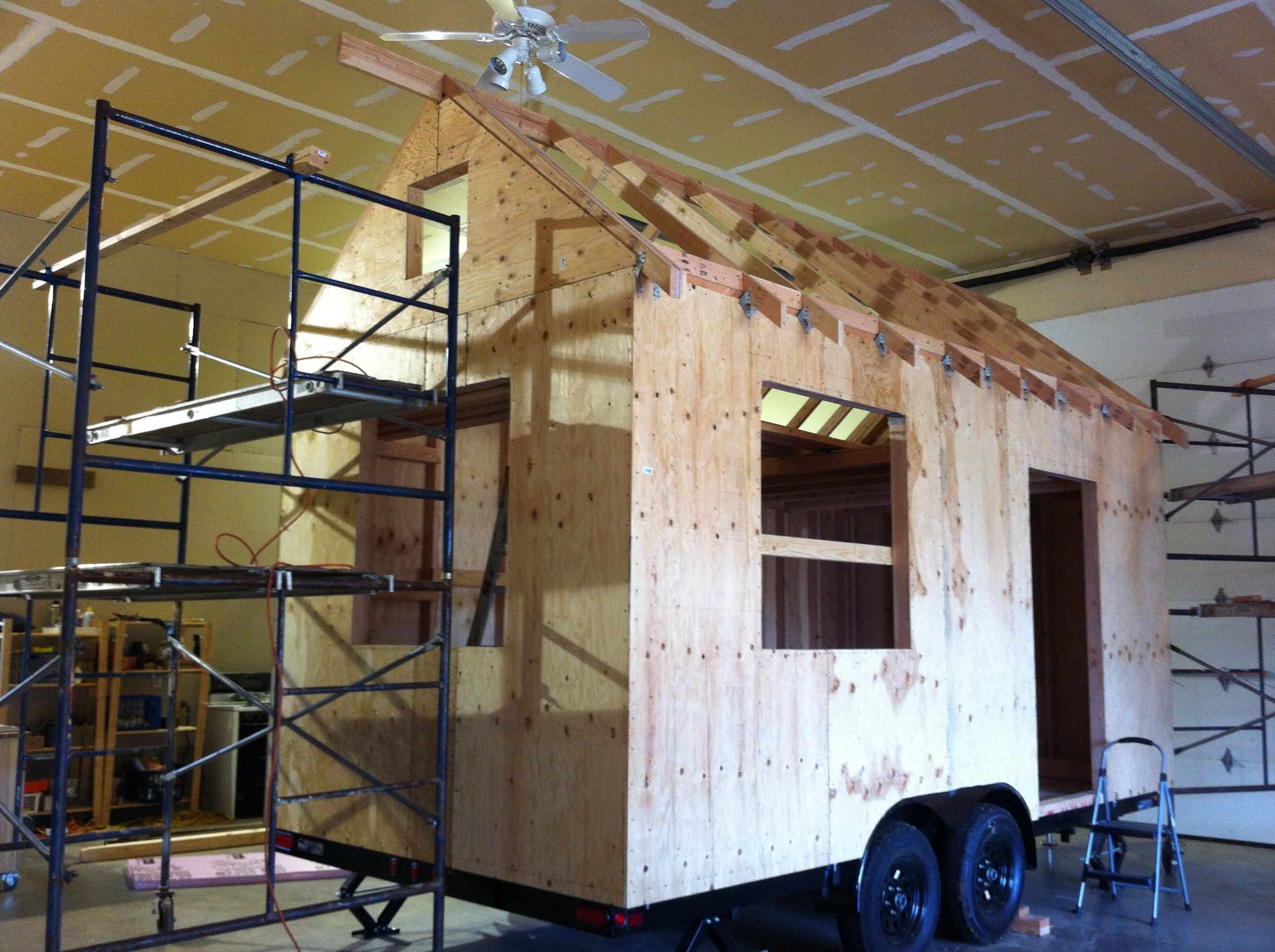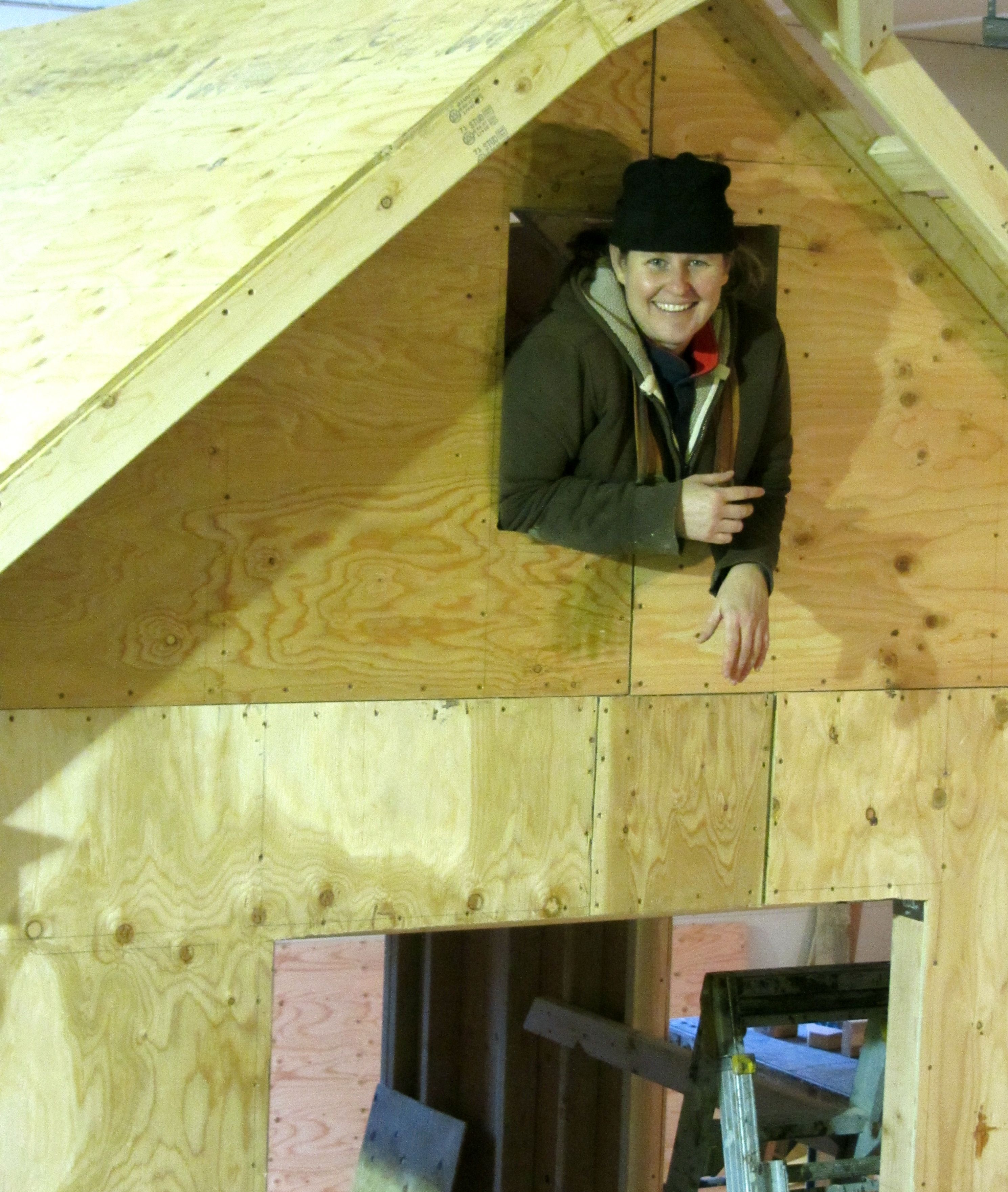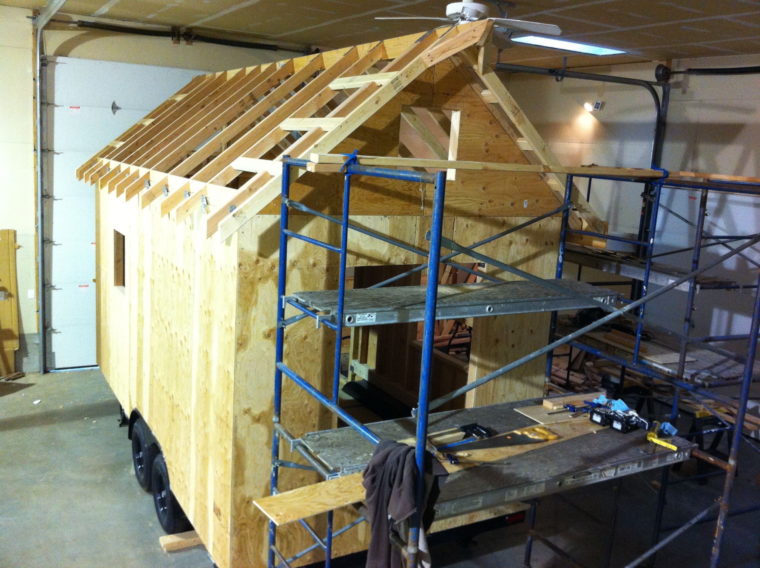 On top of this, I was contending with my heights phobia so I moved at the speed of a sloth while on the scaffolding and perched on the ledge mounted on the roof. As a result, I made very little obvious progress but I feel good about what did get done. There were a myriad of details that had to happen before I could sheathe the roof: blocking, hurricane ties and strapping, framing and sheathing the gable ends, laying in the outriggers and flying rafters, figuring out my house “ears”, caulking the blocking, and framing the skylights – and of course they all took longer than I expected. I also continued to do research; tried (and failed) to procure more green building materials; ordered my gas heater, stove top and ventilation fan; and dealt with returning a load of moldy sheathing. Oh, and celebrated Thanksgiving in the midst of all that with my dear family!