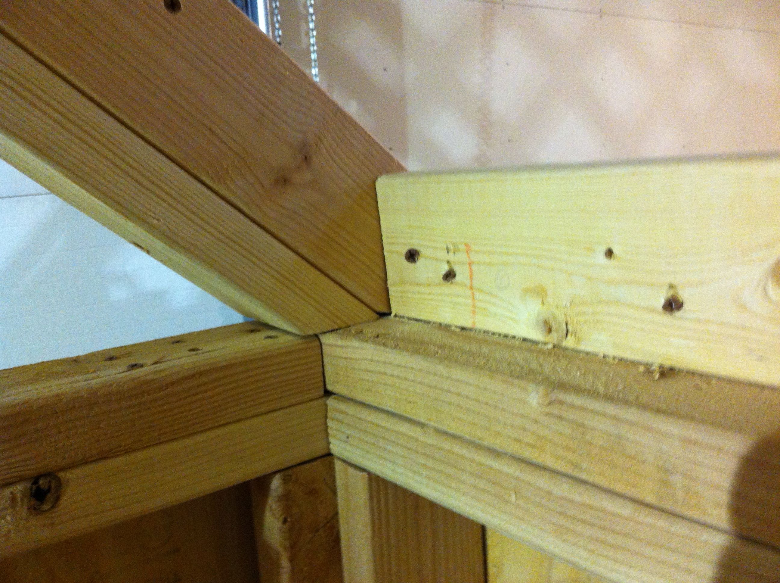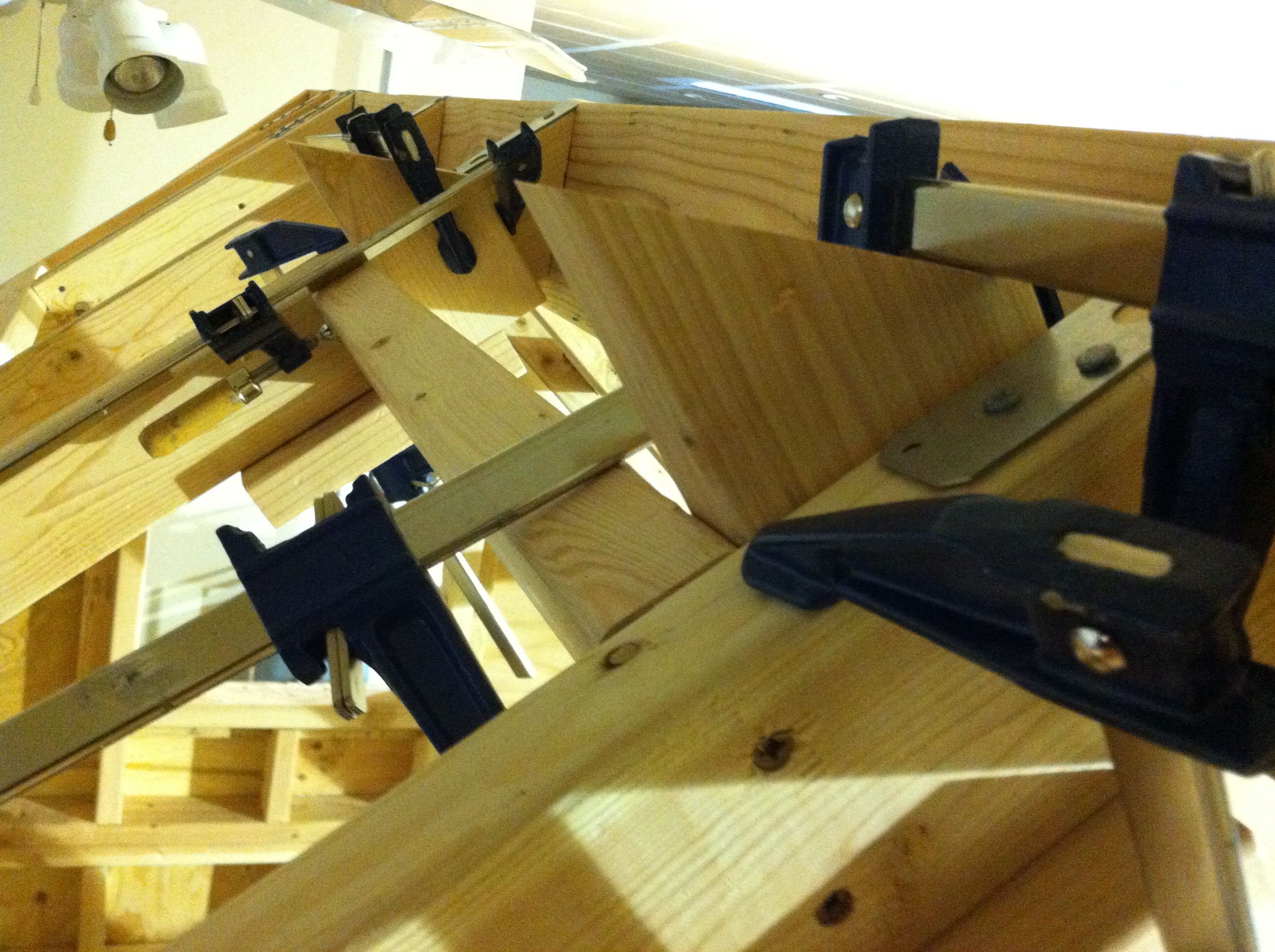 Installing the blocking between the rafters and starting the framing of the gable ends. Having that mitered piece slide right in made me feel like such a carpenter.