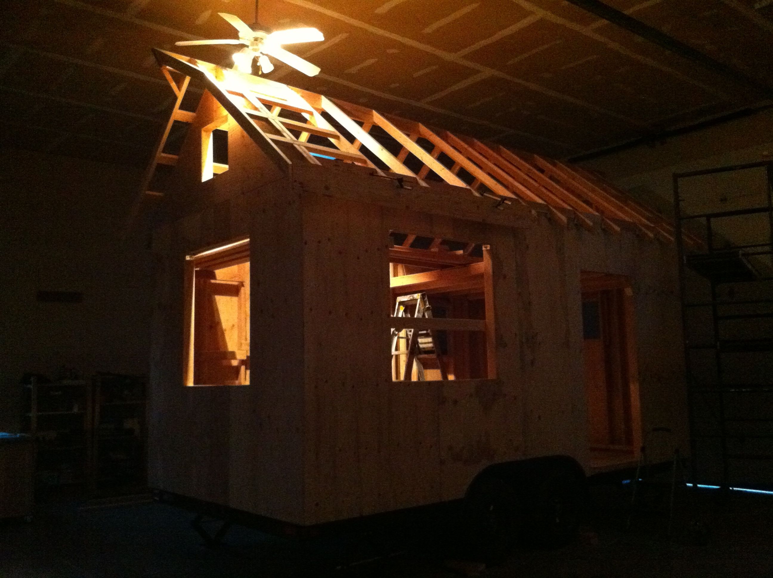 I stuck a thermometer in the door way of my tiny house. I needed it to stay above 40 to apply the glue for the sheathing and caulking. Fortunately the barn is well insulated and it stayed at about 50 if I didn’t open the doors. I had to do this delicate dance between getting enough ventilation and not letting it get too cold.