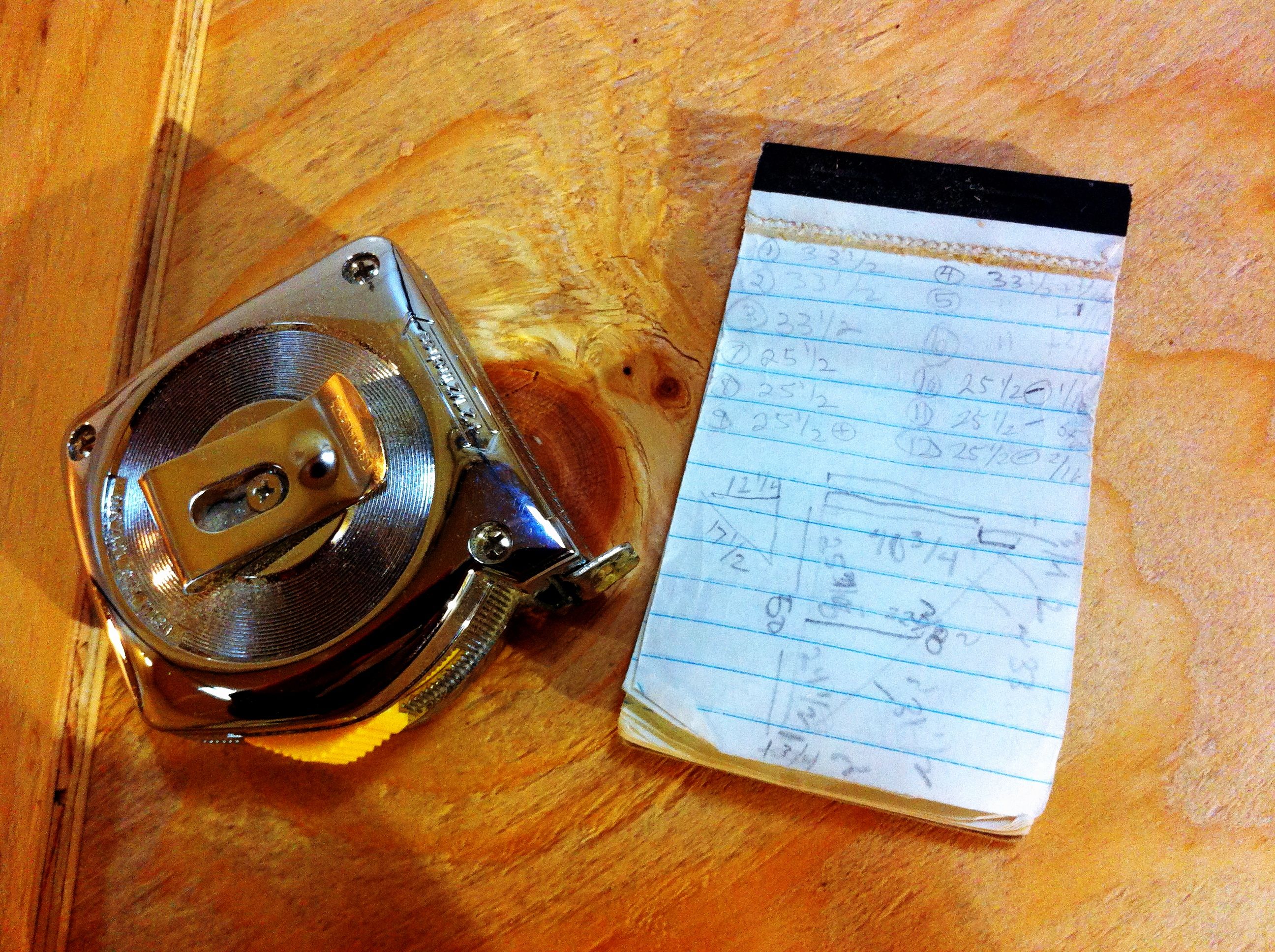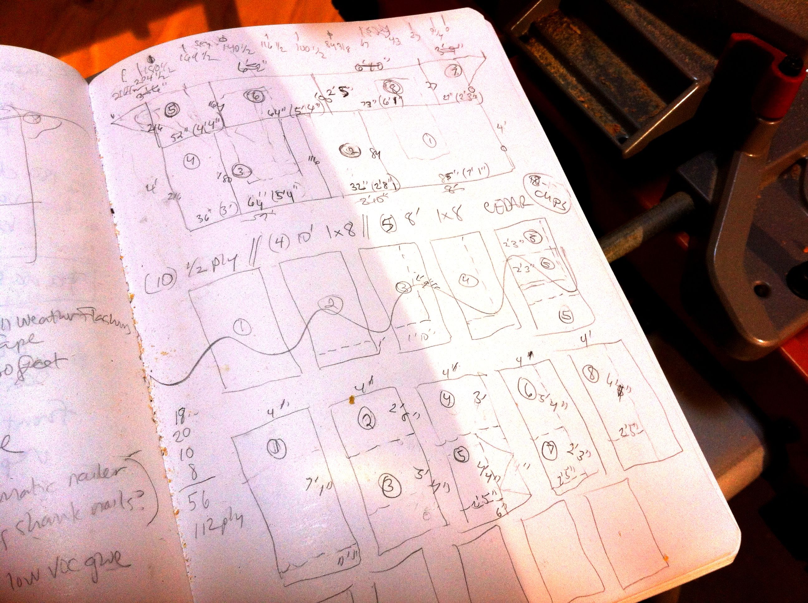 This was a critical page of my notebook where I figured out the measurements for the sheathing pieces and how to lay them out using the least number of plywood sheets.