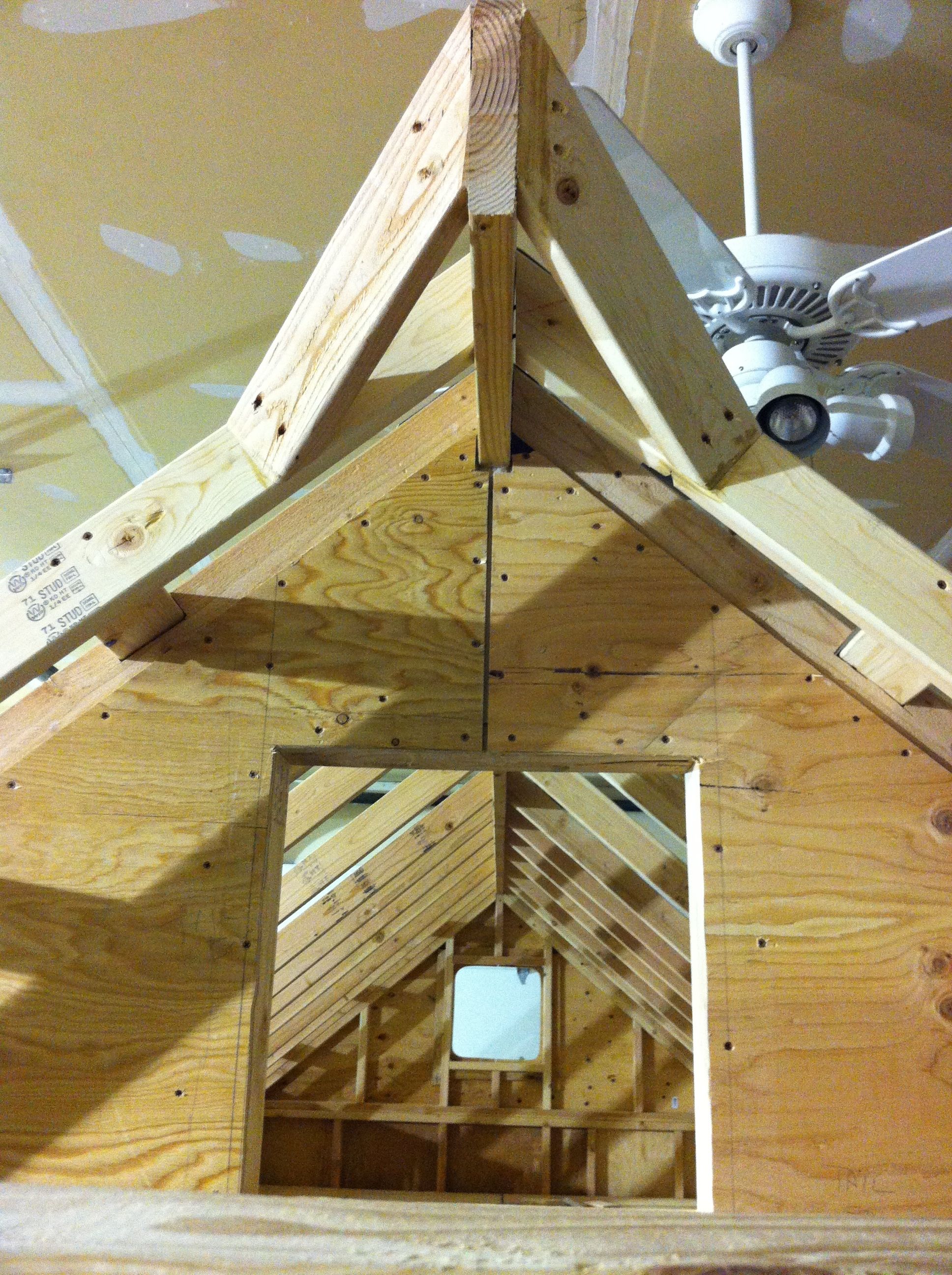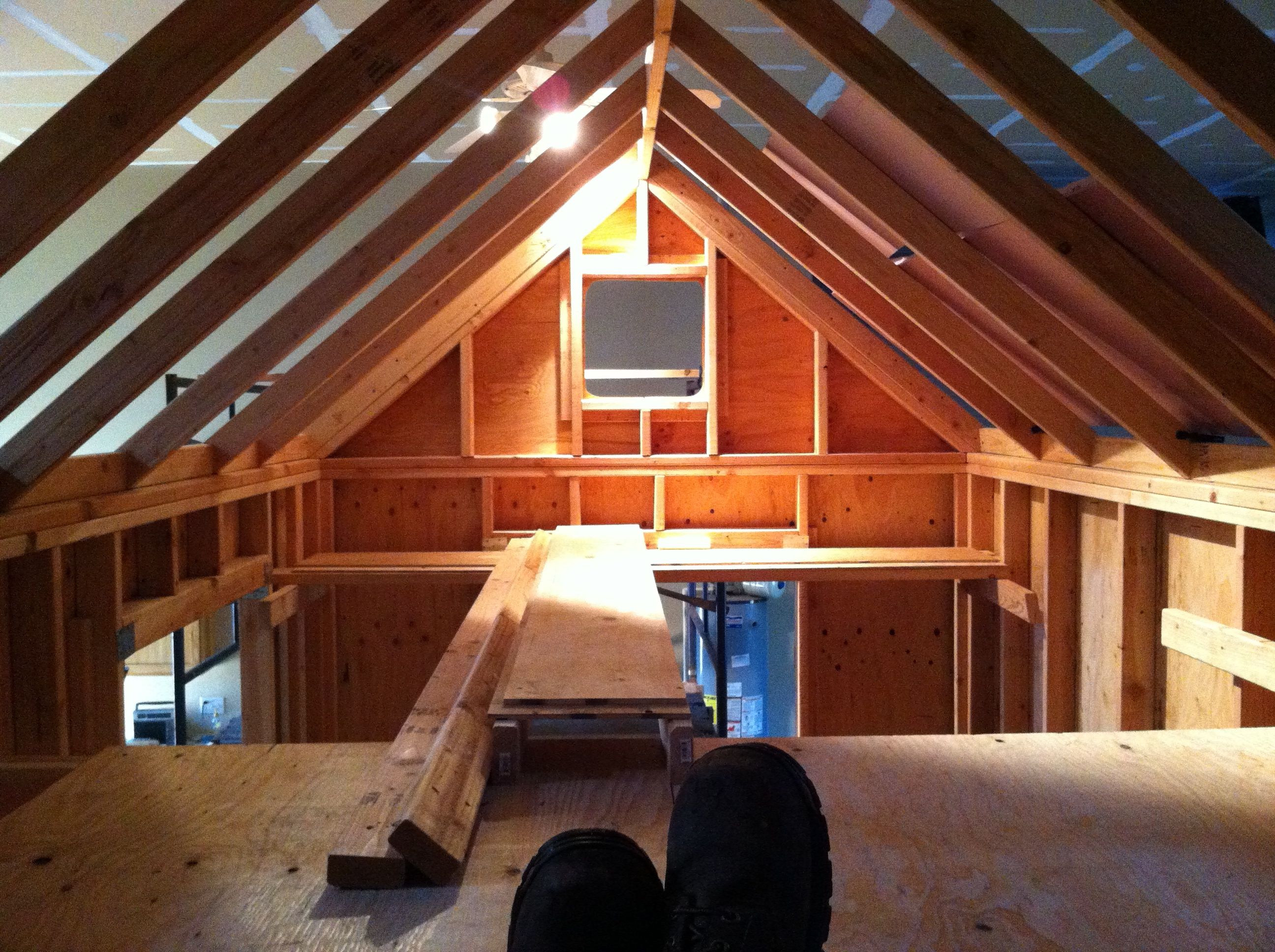 Relaxing in my loft looking out at the enclosed gable end over the living room. The two catwalks are temporary.