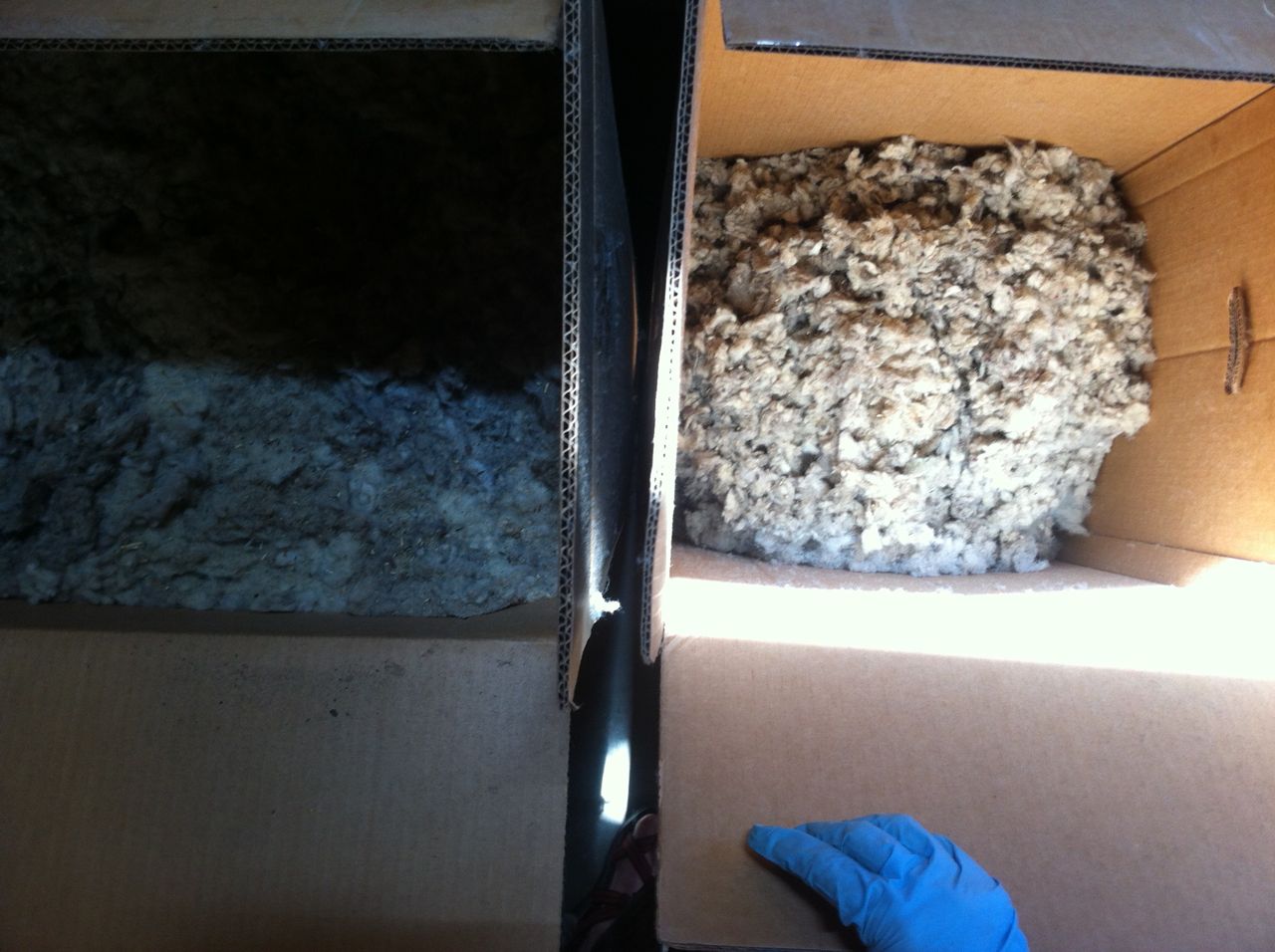 It’s hard to see, but about 5″ of compressed wool from the box on the left resulted in 15″ of fluffed wool on the right.