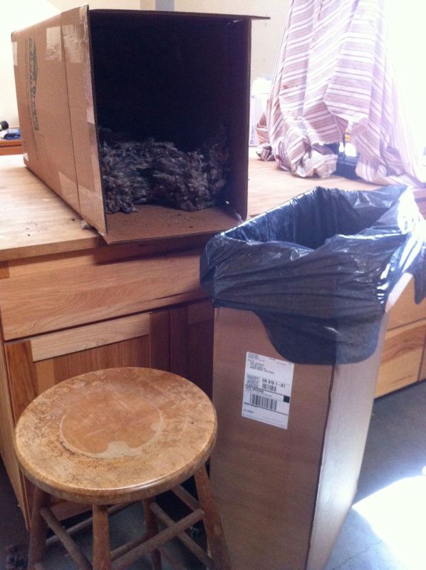 The fluffing station. This box was a good height to rest my arms on so I started using it to hold plastic trash bags that I filled with wool.