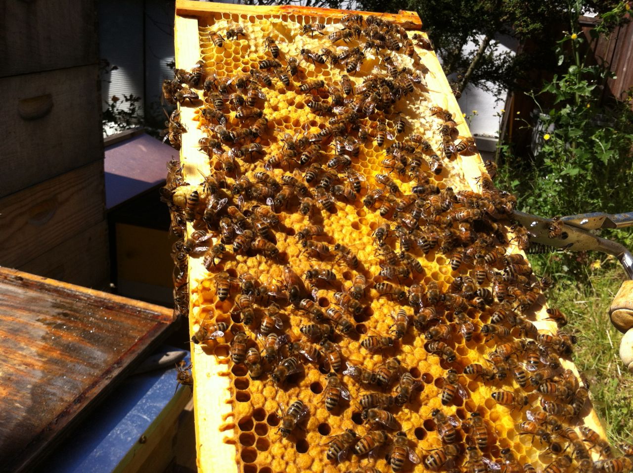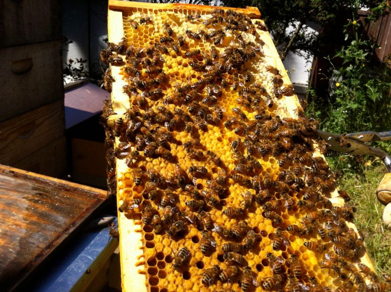 This one has more honey. There’s actually a lot going on here. Some workers are building a new cell for the queen. It is on the left, perpendicular to rest of the comb cells. It will be filled with royal jelly for her. In the foreground are cells filled with something called “bee bread”.