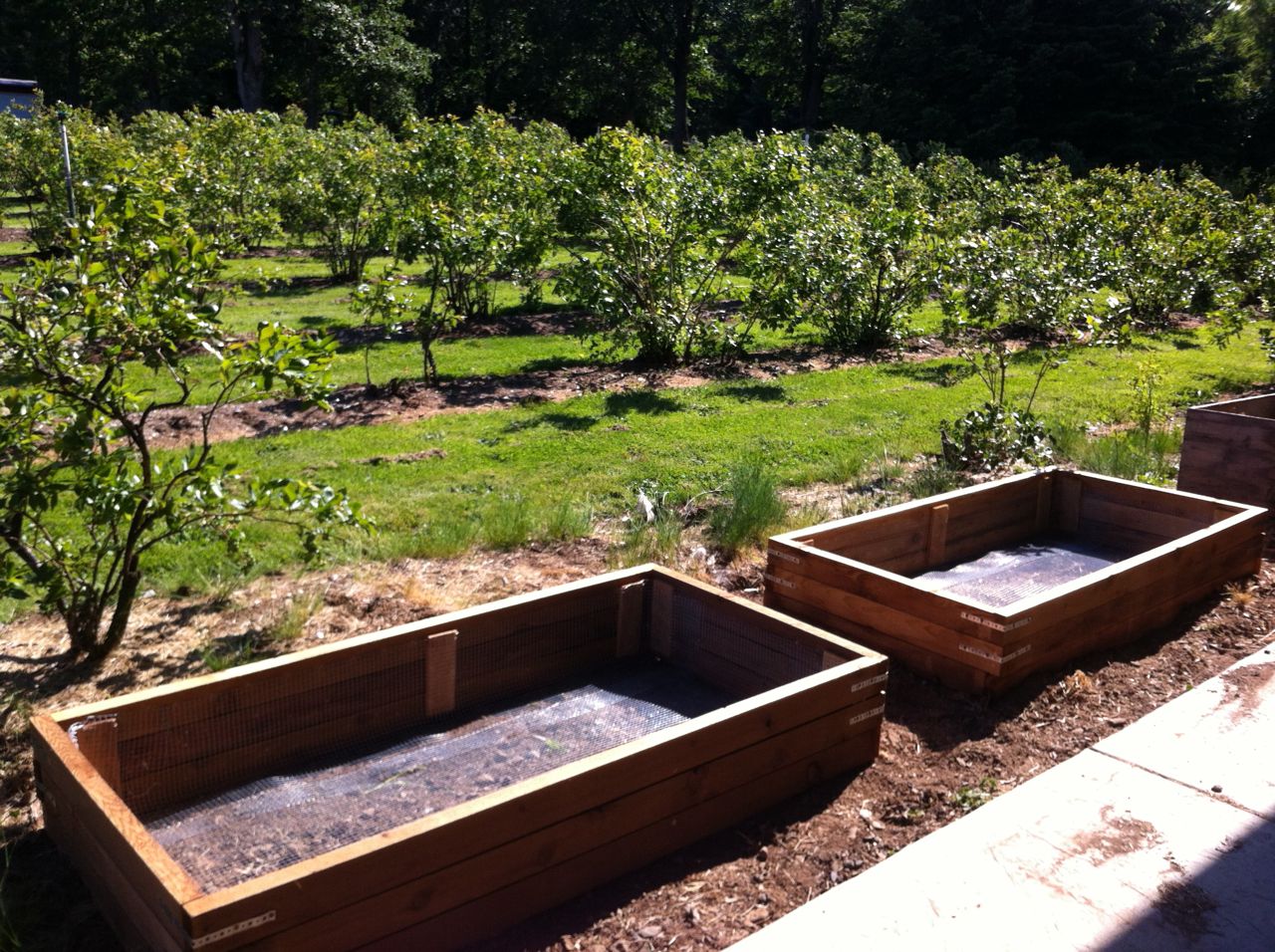 This spring we decided to build raised beds for vegetables. We put these together and I stapled screen along the bottom to keep out critters coming up from below.