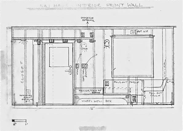 An early drawing of where to place electrical boxes. I had made scaled as-built drawings of my stud placements and then put tracing paper over them to plan out both my wiring and my cabinets.