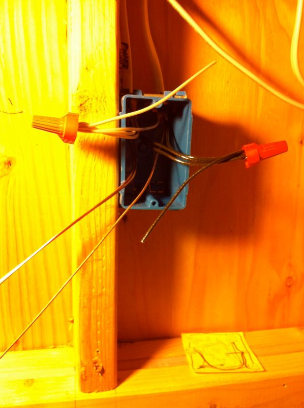 I added wire connectors and pig tails to the neutral and hot bundles. I added a barrel crimp to the ground wire bundle, leaving one wire long (see next example). This long wire and the two pigtails will connect to the outlet device while maintaining a continuos circuit independent of the device.