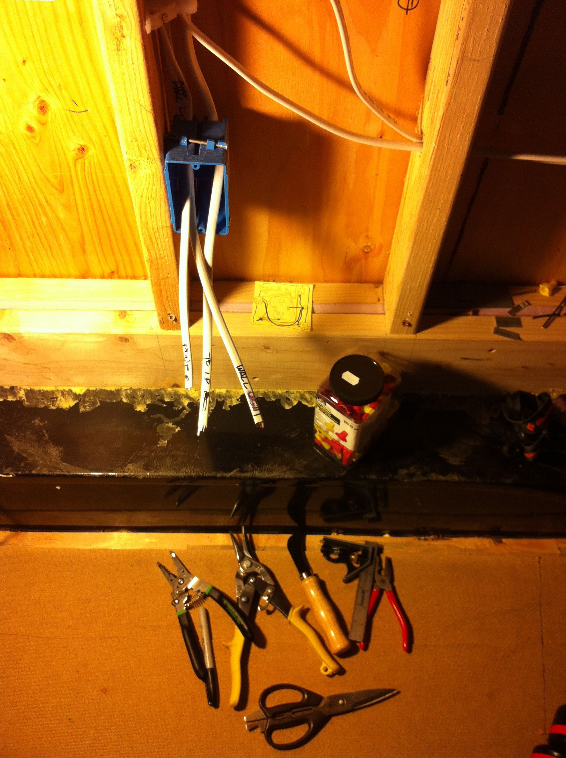 Here is a box prior to making it up. It is a middle-of-run outlet (receptacle) with one cable coming in bringing power and two cables going out, acting as a mini-hub, branching power to a wall light above and the next receptacle on the circuit.