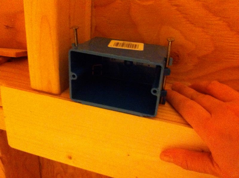 The nail-in boxes may not work in every location depending on how they are oriented. In the photo above, it was difficult to pound in the nail due to the proximity to the stud. I also found that it is harder to keep the boxes in the right alignment when you pound them in; they tended to slip back slightly into the wall so that they weren’t always as flush with my paneling as I would have liked. Definitely make sure you don’t have a gap that exposes the inside of the box to combustible materials around it.