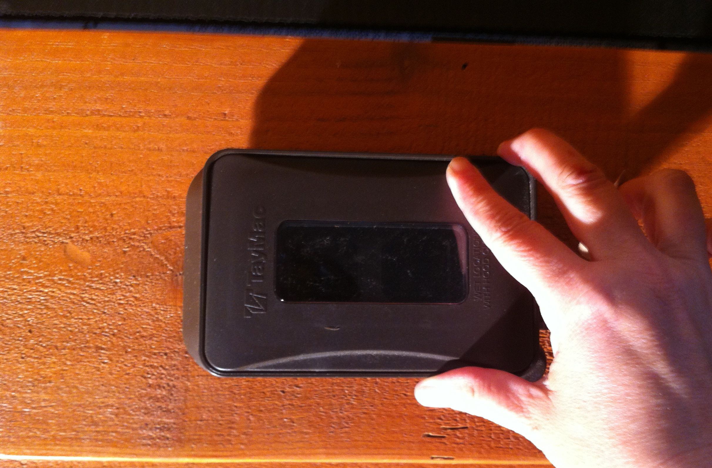 The cover closed. Although it’s made of plastic, I liked this model because it allows you to plug something in and run the cord out a hole in the corner while the cover remains closed.