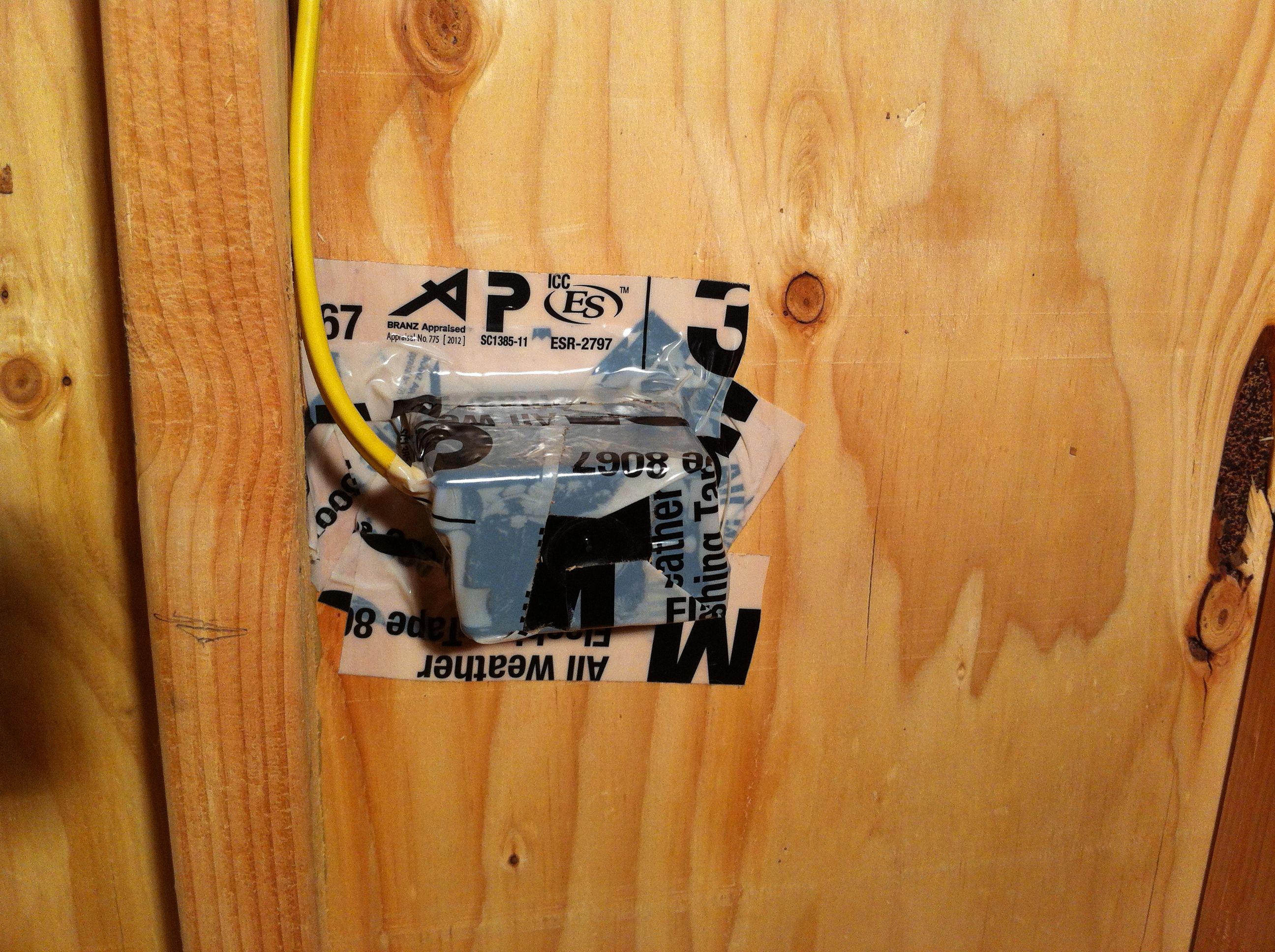 I then used 3M flashing tape to seal the gaps around the exterior boxes, both to provide an air barrier and also to prevent the spray foam in the next step from extruding to the outside.